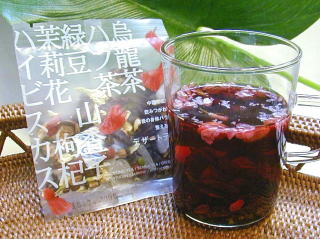 | グラスマグで煎れた画像は「紅夢」です。ハイビスカスがブレンドされているので、 かなり鮮やかな色が出ます。「翡翠」「芳醇」は、もっと普通にハーブティーな色になります。 |