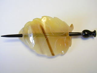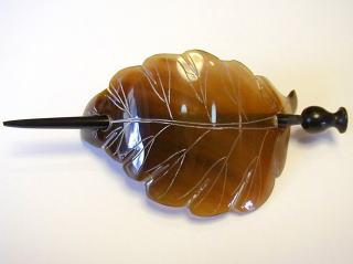 | 水牛の角で出来た、シックな髪留めです。 1点ずつ葉っぱの形に手仕上げされており、 バッファローホーン素材の持ち味である色柄が楽しめます。 全く同じものは存在しません。すべて、たった一つしかないお品です。 まとめ髪の上にかぶせてスティックで留める「マジェステ」というタイプ。 店主も超愛用しています。 普段使いはもちろん、きちんとしたい日や和服にも合わせられる、 かなりのお役立ちアイテムです。 心からお薦めします。 |