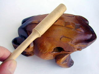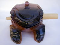 | かえるの形のインテリア楽器です。 スティックで、背中のギザギザを撫でてあげると、 コロコロ♪と鳴きます。 小さいサイズは高い声、大きいサイズは低い声。 このへんは、本物のかえると一緒ですね。 大小サイズ、 それぞれ緑と茶色の2色をご用意しています。 ↓かわいがり方の一例。独自に仲良くしてください。 |