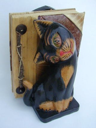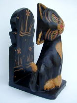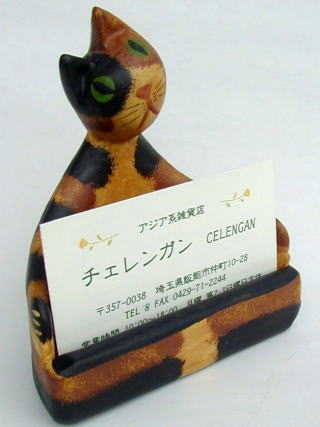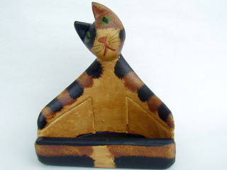 ちょっとした本や、郵便物などを立てられます。 お行儀良く座って、なにやら思案中のご様子。 首を右に傾げたねこと、左にかしげたねこがいます。 (写真は右です) 18cm×10cm×11cm 1260円 完売しました |