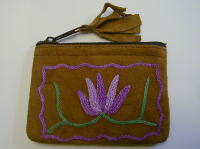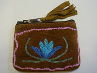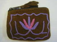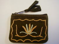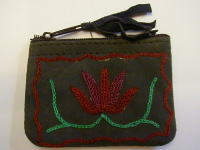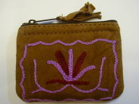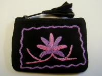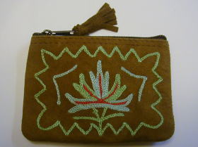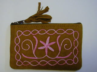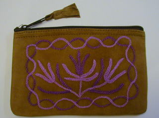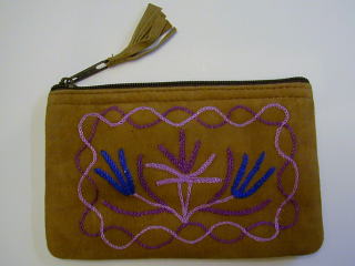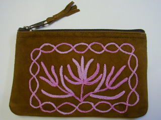 スウェード地に毛糸で花の刺繍を入れた、リッチなポーチです。