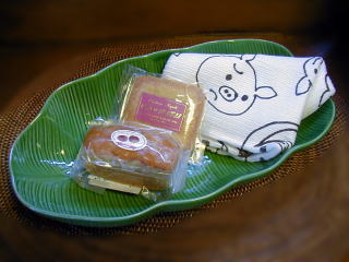 | 一番大きいサイズ(1260円)に、 こぶたのディッシュクロスと焼き菓子を添えてみました。 (お菓子は当店の商品ではございません…) |