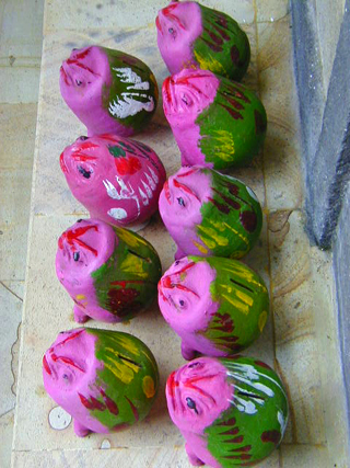 | 「チェレンガン」というお店の名前の由来を よく訊かれます。 チェレンガンcelenganとは、インドネシア語 で「貯金箱」という意味で、バリ語の 「celeng=ぶた」と、インドネシア語の 「an=〜的、〜ぽい」という二つの 言葉が合わさって出来た言葉です。 ぶたに似せて作られたこのピンクの 貯金箱が「ぶたっぽい→celengan」と 呼ばれたことが語源になっています。 |