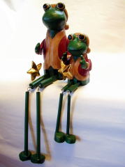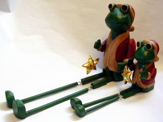 | カーミットも顔負け!?足のながーーい、かえるサンタ。 星を片手にごきげんスマイルです。 緑のボディも何気にクリスマスカラーなのでした。 |
